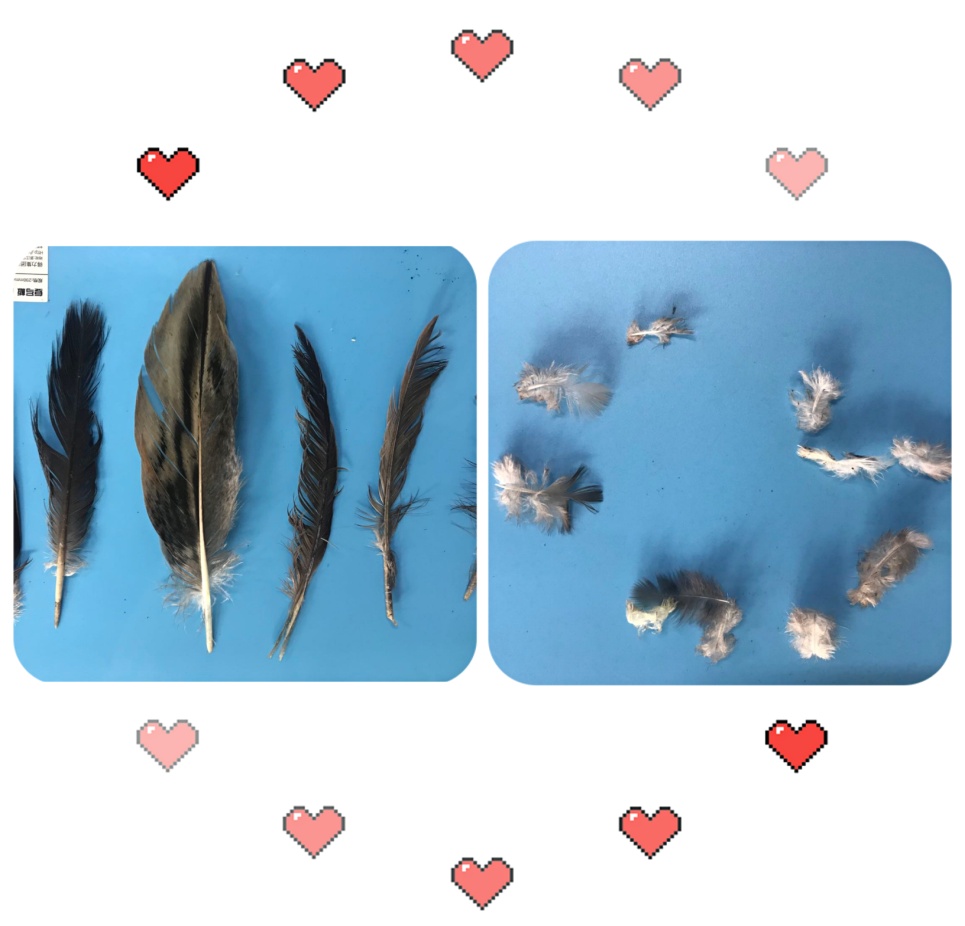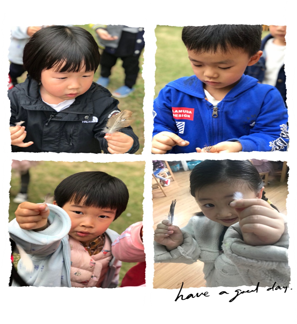 带着孩子们一起来到草地上,找一找掉落在缝隙里的羽毛,孩子们有了惊人的发现,找到了很多不同的羽毛。我们来到了教室里,开始将羽毛进行分类摆放。结束以后,孩子们发现羽毛有大有小,又长有短,有软有硬。“这些羽毛到底是在鸟的什么位置呢?不同的羽毛有什么作用?”孩子们进行了大胆的猜测。