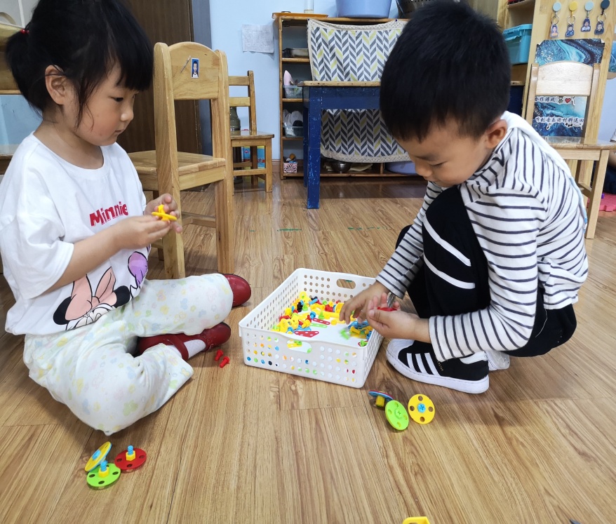 在教师进行区角巡视时,发现了一些不一样的游戏活动。小季和果果正在使用塑料的工具箱进行拧螺丝的游戏。他们会用长螺丝将不同形状的图形紧紧地拧在工具板上,并且将这些图形拼成不同的图案,有房子也有轮船。