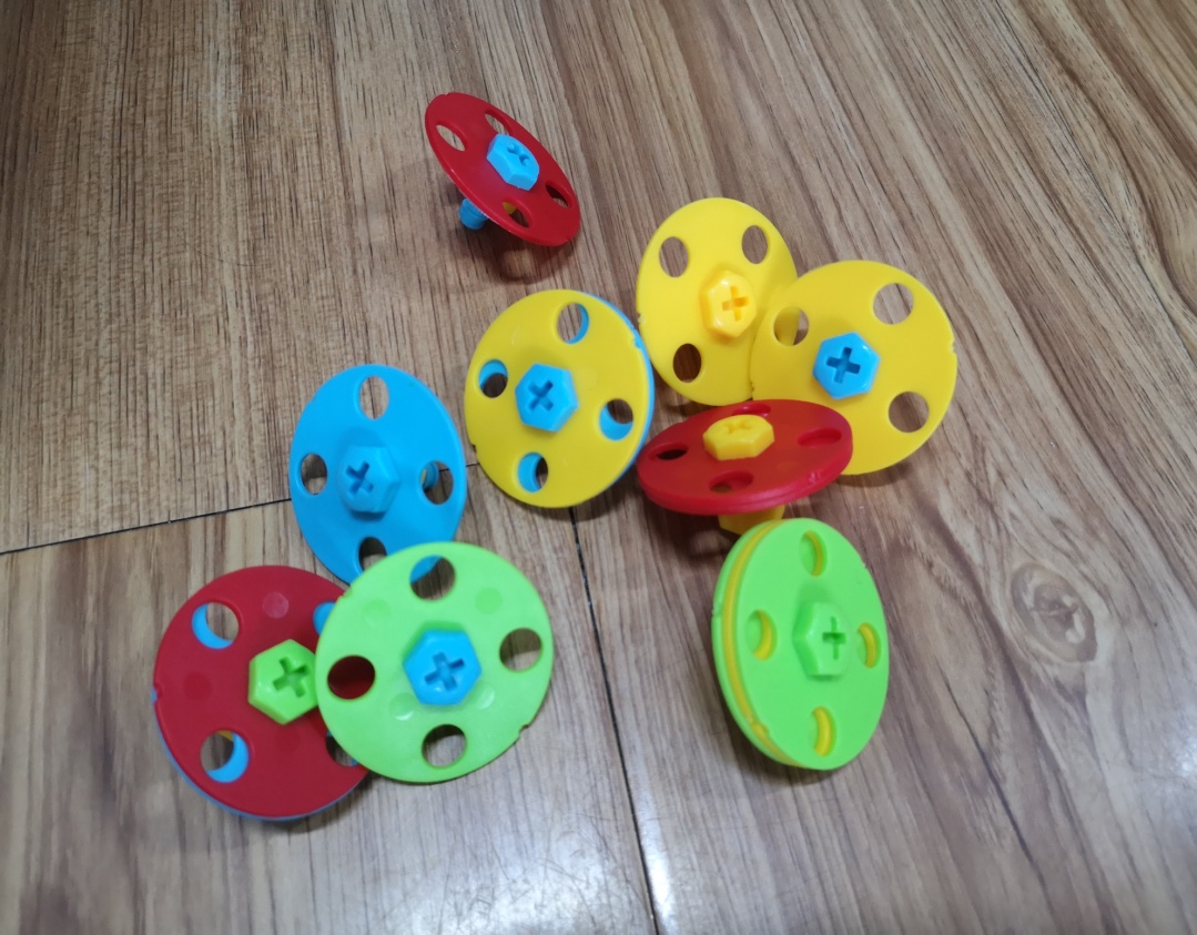 又过了一会儿,,果果突然来到我身边,告诉我,他们拼出了一个不一样,更有趣的东西。我定睛一看,原来,他们使用塑料小圆片和长螺丝拧出了一个“陀螺”。还真是有模有样。“这个陀螺可以转起来吗?”“当然可以了。”说着,他们便将自制的陀螺放在地上开始旋转起来,“老师,我的这个陀螺可以转很长时间哦!”“真的耶!太棒了!”