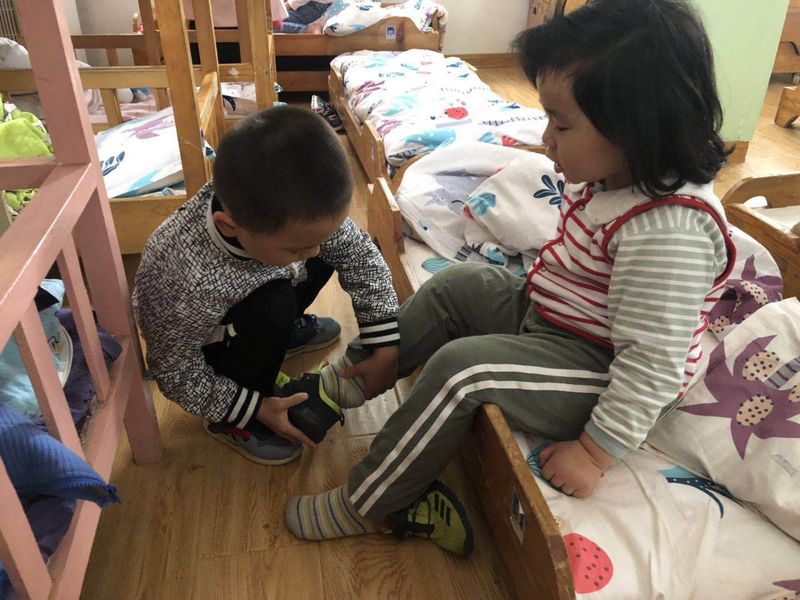 “助人小分队”到达小三班,他们开始帮助弟弟妹妹穿衣服,穿鞋子。谈保鹭小朋友很温柔地帮助妹妹穿鞋子,小心翼翼地就像照顾小宝宝一样;胡妍钰小朋友也在认真的帮助弟弟穿鞋子,她先告诉弟弟怎么穿鞋子,弟弟试了试,请求姐姐帮忙,胡妍钰很细心地帮助弟弟整理好鞋子。方孝然小朋友帮助弟弟妹妹穿外套;王宇轩和周梓玥先告诉弟弟妹妹们怎么穿外套,他们轻声细语地告诉弟弟这个帽子对着自己的肚子。在哥哥姐姐的帮助下,小三班的弟弟妹妹们衣服鞋子都穿戴整齐了,看着他们脸上开心的笑容,听到他们一声声的“谢谢哥哥姐姐”,“助人小分队”成功完成任务。