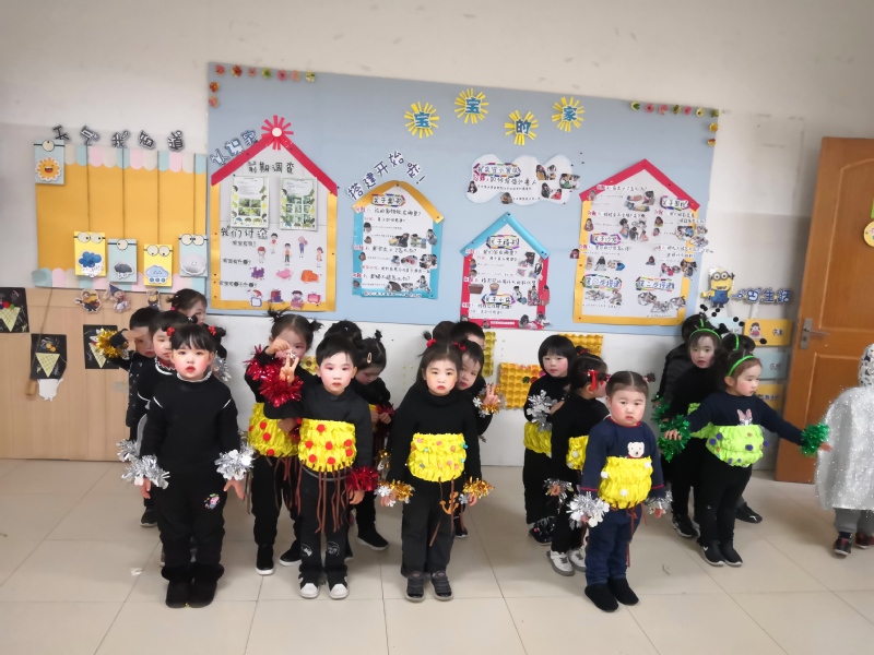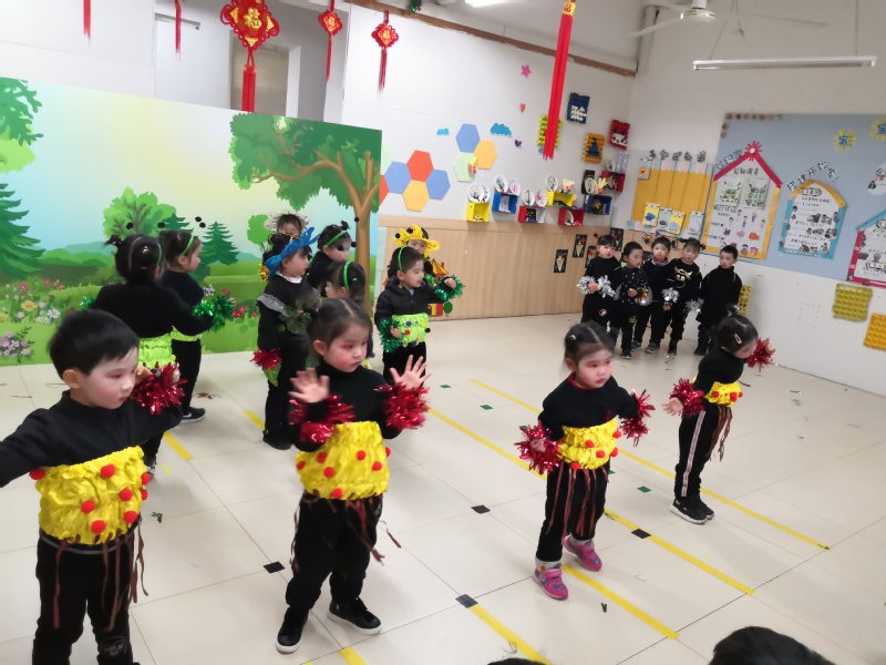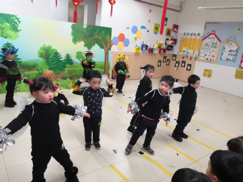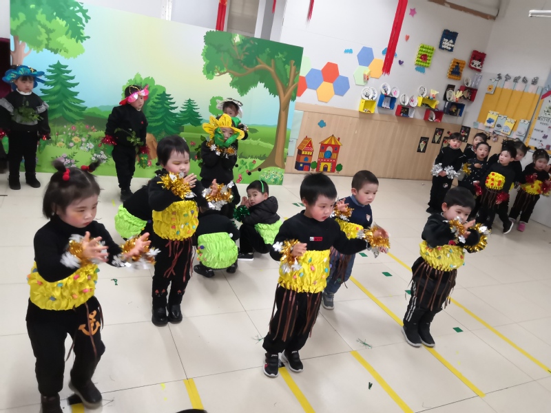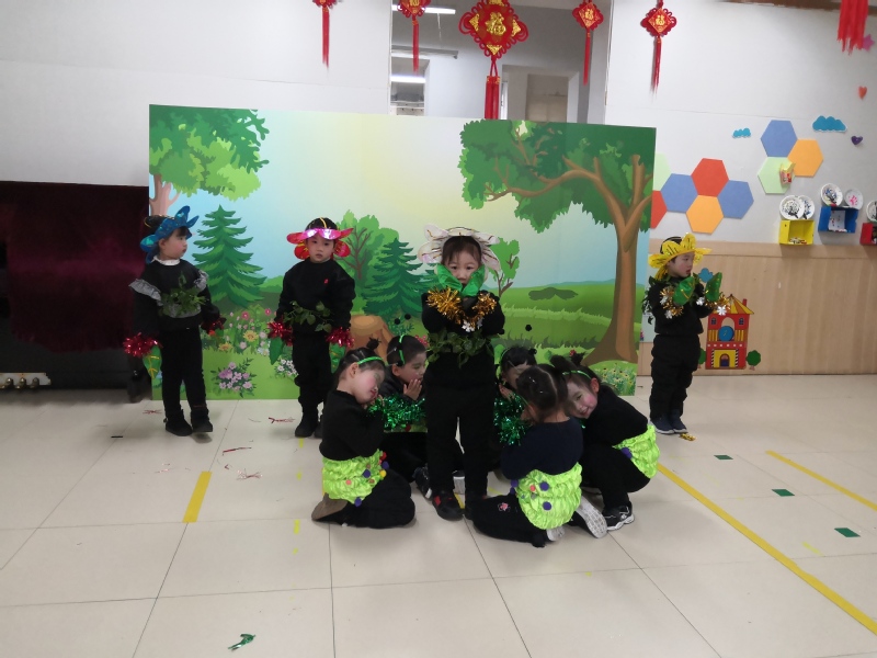 表演开始之前,孩子们穿上角色服装,带上美丽的头饰,化了漂亮的妆,整装待发。音乐响起,小花开始跳舞,做自我介绍,接着毛毛虫上场啦,孩子们扭一扭、跳一跳,神气极了,快看,雪娃娃跳着律动上场啦,开心地和毛毛虫做游戏,迎春花边跳舞边唱歌,多漂亮,红色玩具、浪花快乐地舞蹈着,蝴蝶挥动着漂亮的翅膀飞呀飞。