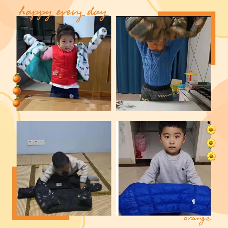教师先让幼儿先自己尝试穿外套,发现穿衣时遇到的问题。之后教师引导幼儿如何穿外套 ,分为以下几个步骤:首先我们将外套平铺在地上,人现在帽子的这边,找衣服袖口两端的洞洞,然后将两只小手放进洞洞里,最后衣服翻过来,这样我们漂亮的外套就穿啦!教师先进行示范,幼儿再自己尝试。教师也将本次穿衣服的视频发送在班级群中,让家长在家多对幼儿进行巩固。现在,孩子们起床后都可以自己穿外套。