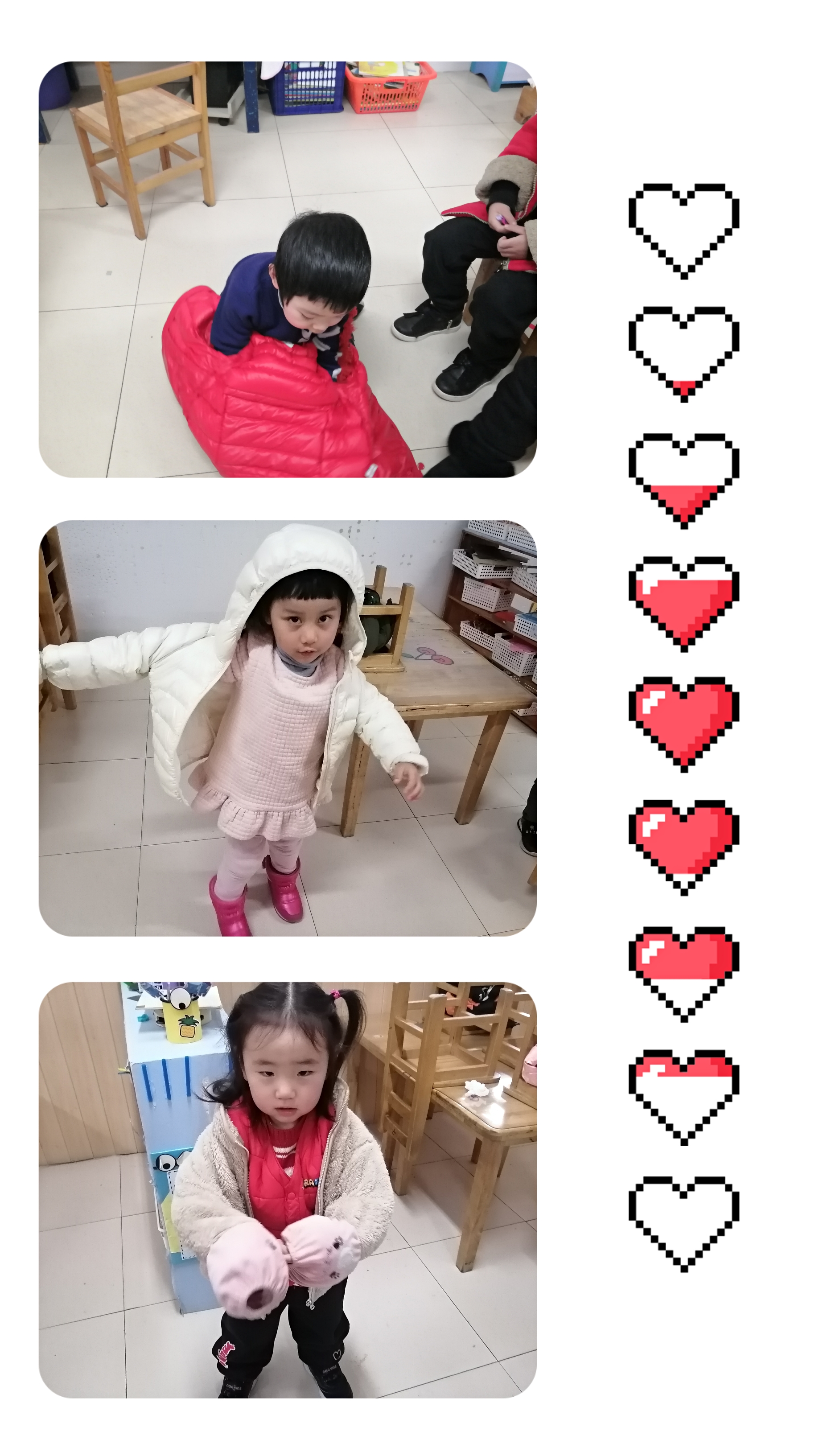 新的学期开始了,可是天气依旧很冷,小朋友们也都穿着厚厚的外套。在上一学期大班哥哥姐姐的帮助下,发现幼儿已经学会了穿裤子和鞋子,有了明显的进步。但是由于小班幼儿的年龄较小,自理能力有限,孩子们还不能很好地进行穿外套。为此教师利用集中教学时间组织幼儿学习穿外套方法。
