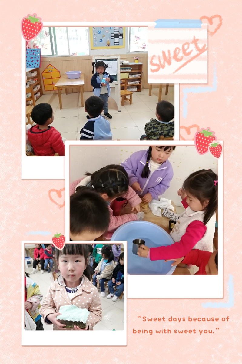 孩子们先收集材料,然后在容器里放入豆子,加入自己想要的水量,最后有的盖上毛巾;有的将毛巾放入容器里面。后期,孩子们每天观察自己的豆子,做好记录,比一比谁的豆芽最先长出来。