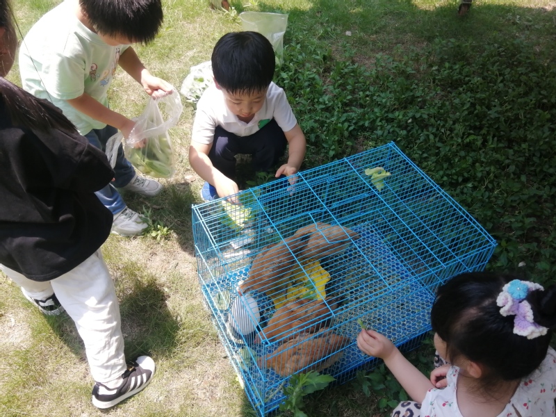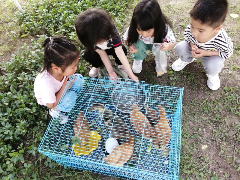 活动中,当天的小值日生,手里拎着提前准备好的食物,蹦蹦跳跳的来到小鸡的身边。小鸡看到小朋友们的到来,更是高兴的想要冲破笼子。孩子们蹲下身来,拿着手里的菜叶,轻轻地的喂给小鸡吃,说:“小鸡你吃快一点,这样就可以快一点长大啦!”