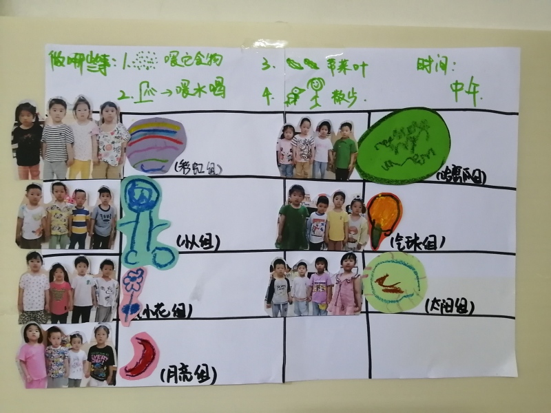 活动前,孩子们通过讨论,自由分组、设计队名,决定自己哪一天照顾小鸡。教师再将幼儿讨论的情况拍成图片发送给家长,让家长了解自己的孩子是哪一天值日,同时提醒孩子们今天轮到自己值日了。
